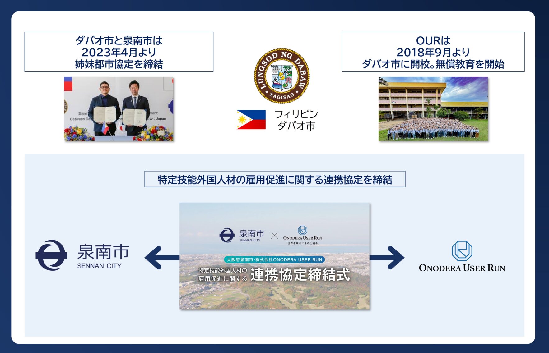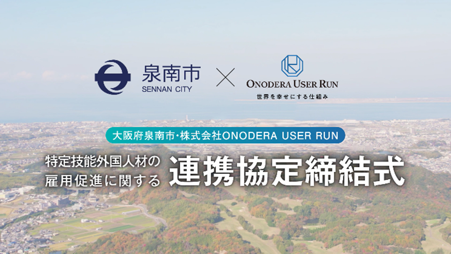 株式会社ONODERA USER RUN(本社:東京都千代田区、代表取締役社長:加藤 順、以下「OUR」)は、深刻化する地方の人手不足などの社会課題解決に向け、特定技能外国人材の雇用促進に関する連携協定を大阪府泉南市(市長:山本 優真、以下「泉南市」)と締結いたしました。
