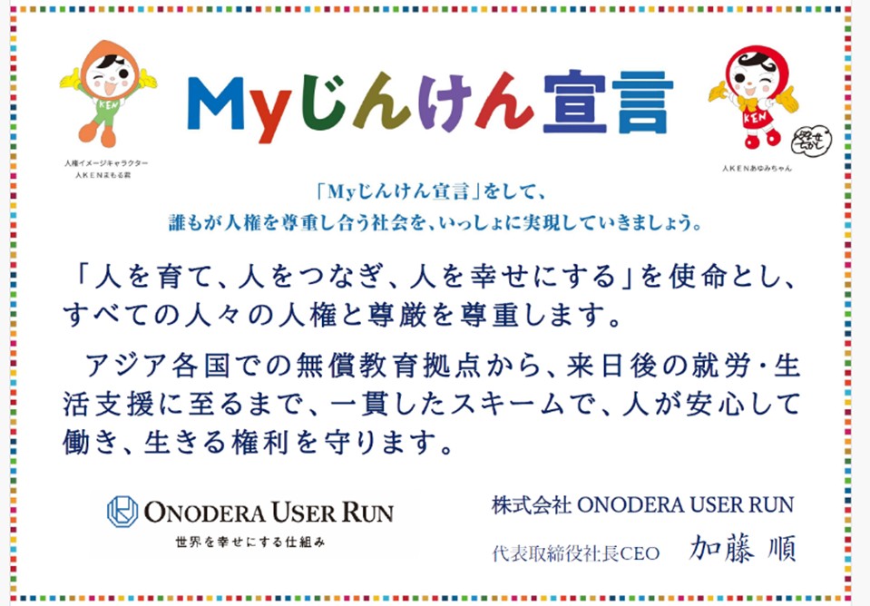 株式会社ONODERA USER RUN(代表取締役社長CEO:加藤 順 所在地:東京都千代田区 以下「OUR」)は、事業活動における人権尊重の取り組みをより明確かつ強固なものとするため、法務省人権擁護局が推進する「Myじんけん宣言」プロジェクトに参画いたしましたことをお知らせします。