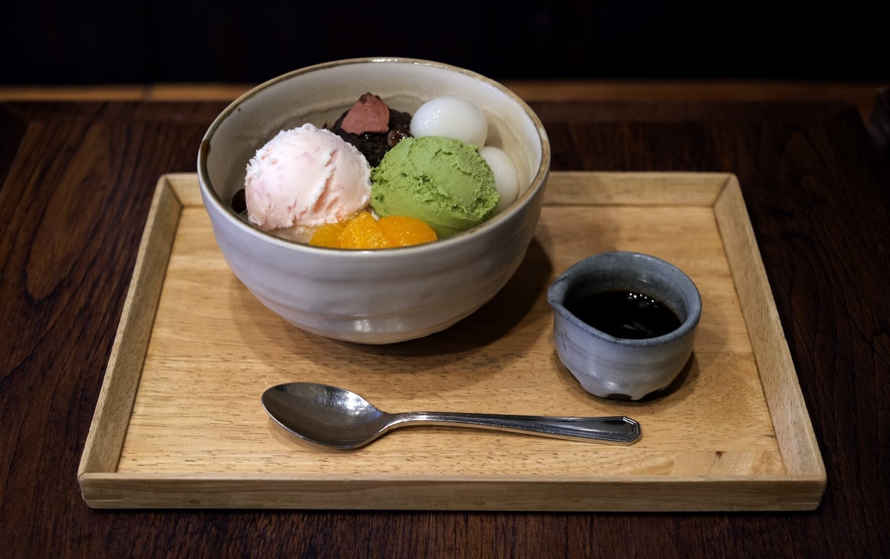 ふんわり桜風味のアイスクリームと桜の塩漬けが、春らしさ満開の特製あんみつ。店内で作る自家製の白玉、寒天、すっきりとした甘さのあずき餡と黒蜜を絡めながら甘味のハーモニーをお楽しみいただけます。